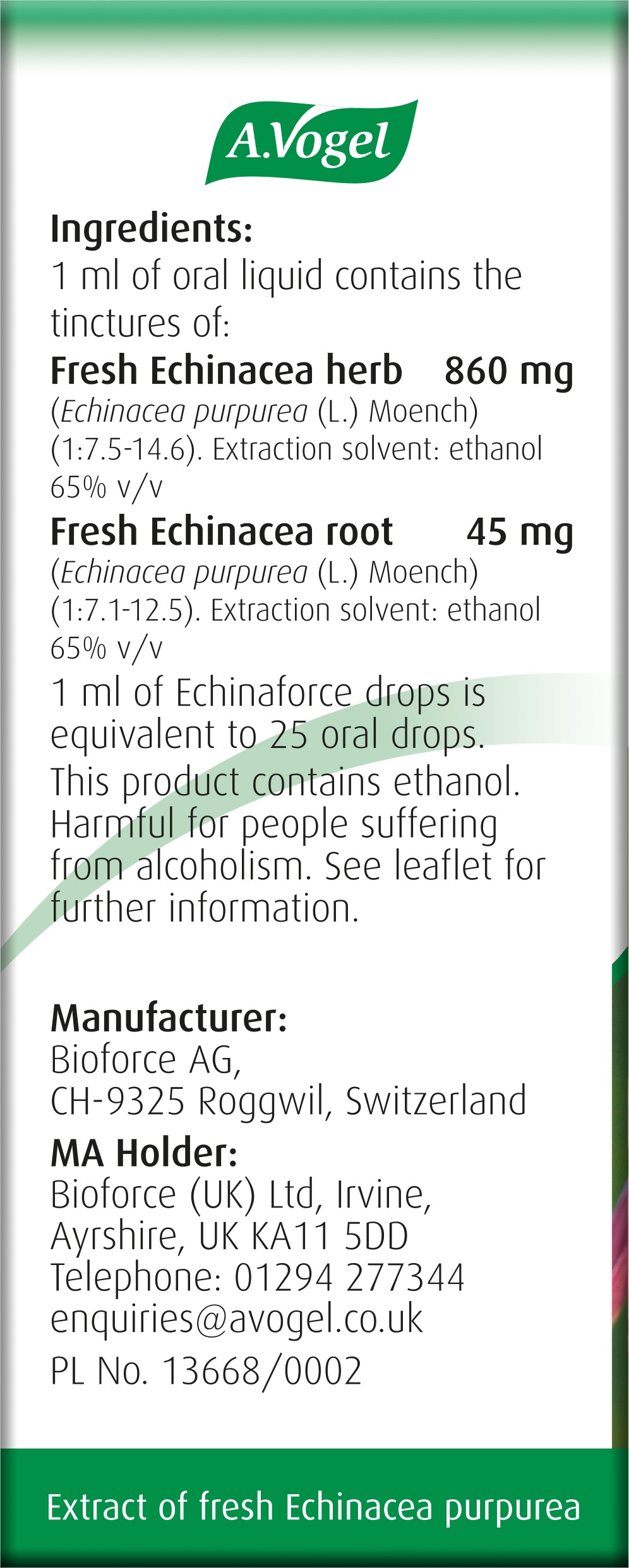 Tincture of Echinacea purpurea herb and root. 0.6ml drops contain the equivalent of 285mg whole fresh plant or 64.5mg whole dried plant. Also contains 65% v/v Ethanol.