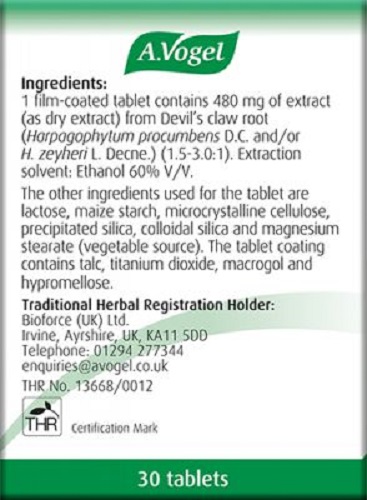 1 film-coated tablet contains 480 mg of extract (as dry extract) from Devil’s claw root (Harpagophytum procumbens D.C. and/or H. zeyheri L. Decne.) (1.5-3.0:1). Extraction solvent: Ethanol 60% V/V. The other ingredients used for the tablet are lactose, maize starch, microcrystalline cellulose, precipitated silica, colloidal silica and magnesium stearate (vegetable source). The tablet coating contains talc, titanium dioxide, macrogol and hypromellose.