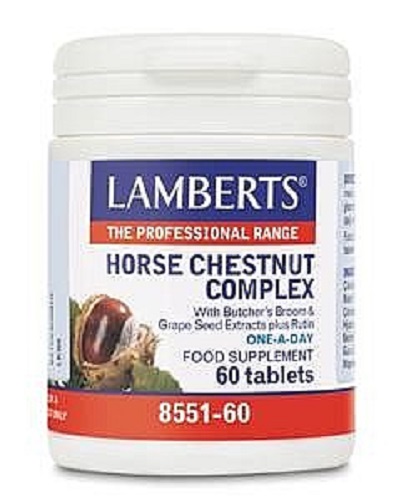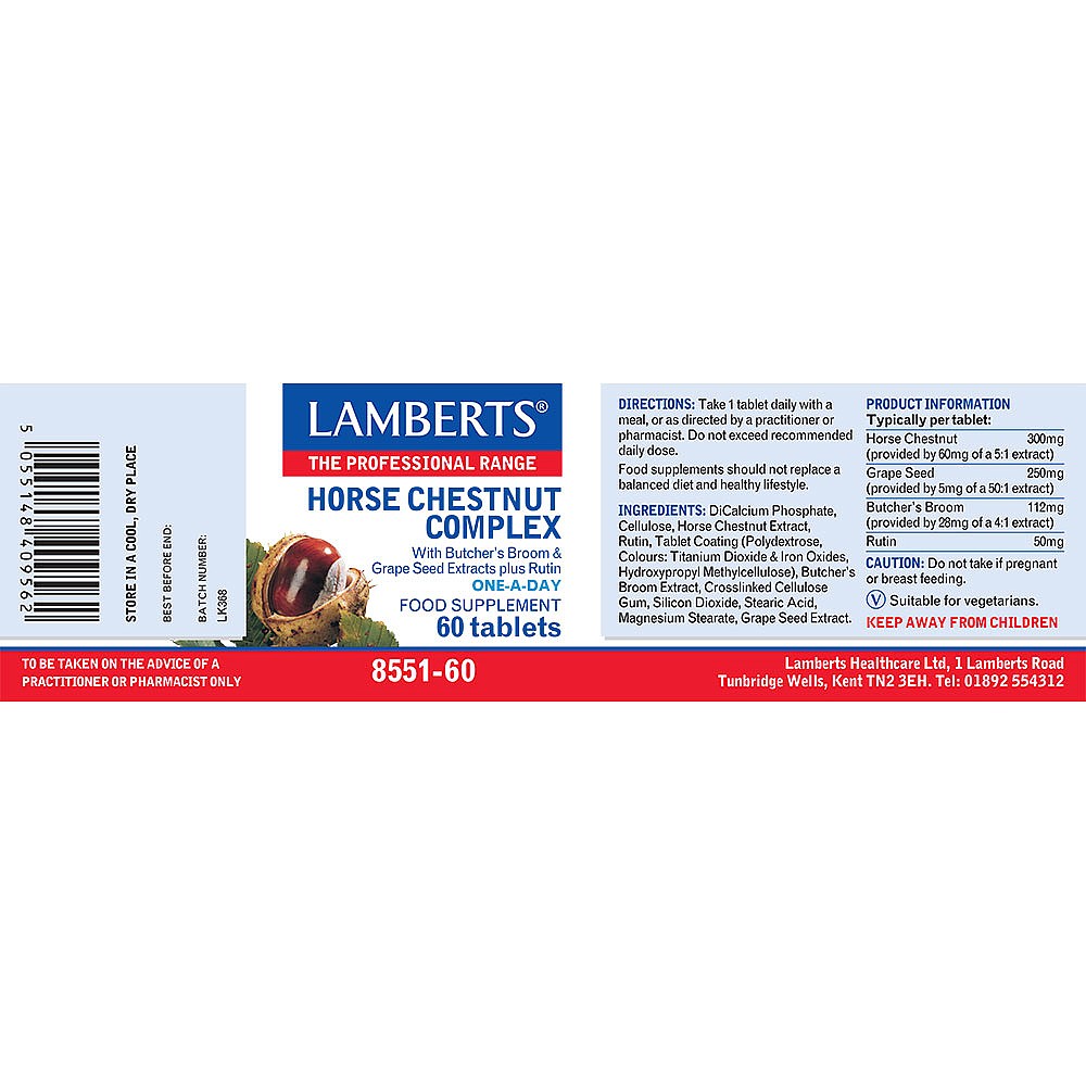 is a unique formula that combines 4 herbs in one tablet: Horse chestnut seed extract provides Aescin the main active ingredient in this herb and Lamberts have added a potent 50mg of this compound to each tablet; Butcher's Broom (Ruscus aculeatus); Grapeseed extract which contains one of the richest sources of anthocyanadins; Rutin a well-known bioflavonoid.